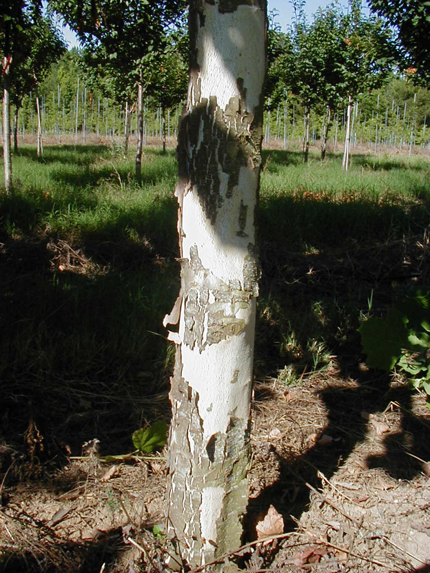 Bark:  Smooth, olive to light gray, quickly develops mottled bark patches of creamy white and olive, gray green Pruning: To maintain central leader